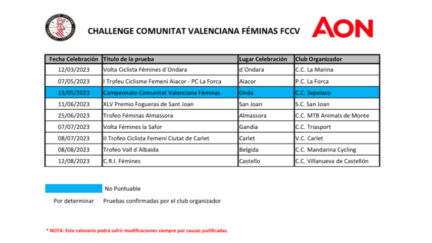 Calendario Challenge Comunitat Valenciana Féminas AÓN